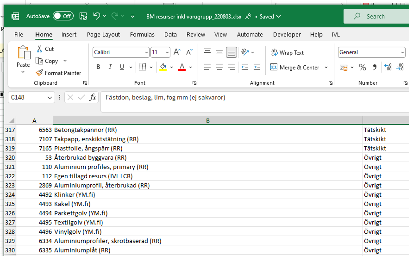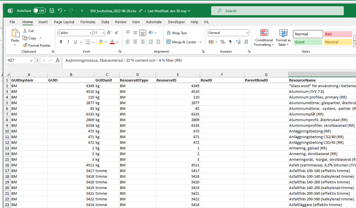 Materiallistan omvandlas till BM generiska importmall som du mejlar som underlag till den person som tar fram klimatberäkningar.