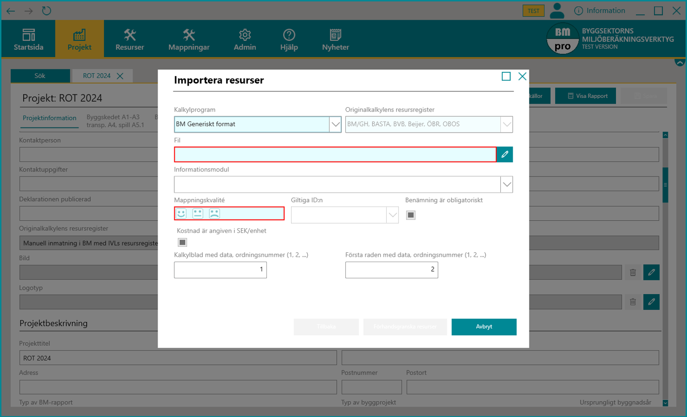 Materiallistan omvandlas till BM generiska importmall som du mejlar som underlag till den person som tar fram klimatberäkningar.